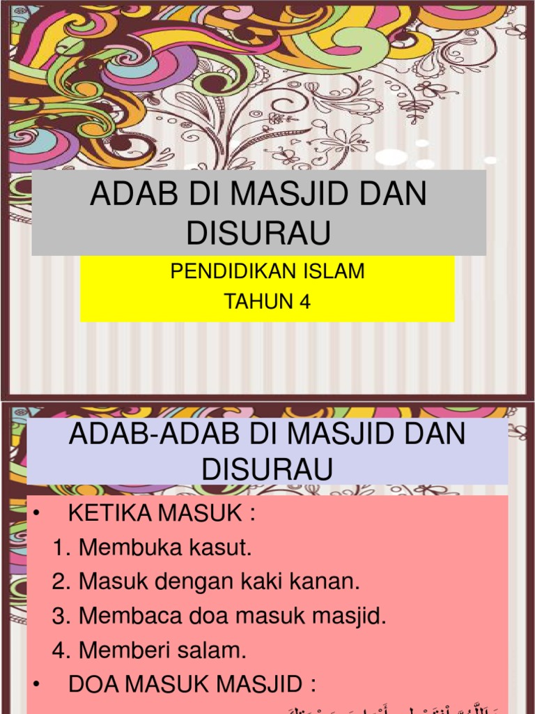 Adab-adab di masjid - ADAB DI MASJID DAN SURAU - ADAB DI MASJID - Adab Di Dalam Masjid - Adab Di Dalam Masjid - ADAB DI MASJID - Tahun 2. Adab tidur di dalam masjid merupakan sunnah Nabi yang boleh kita ikuti diiringi dengan adab dan perlakuan yang baiksopan. Maka bolehlah untuk niat iktikaf semasa masuk masjidsurau.