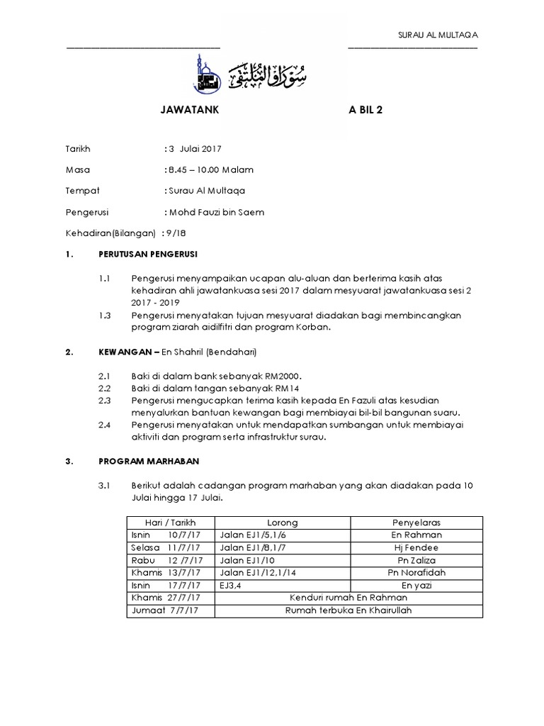 Minit mesyuarat surau. Pembubaran majlis ahli jawatankuasa sesi 20132014 dan. Dewan Sekolah Masa. Mohd Hasrudin bin Tukiran Masa 900 1100 mlm Pengerusi En.