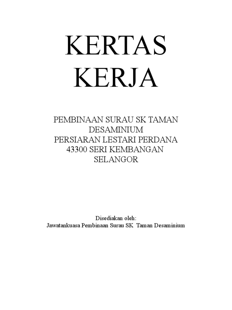 Kertas kerja cadangan tambahan ruang dan pembesaran serta baik pulih surau sekolah by azrymi-1. KERTAS KERJA PENAMBAHBAIKAN INFRASTRUKTURTANDAS SEKOLAH SERTA KESELAMATAN MURID 10 PENGENALAN Sekolah Kebangsaan Rompin meupakan salah satu sekolah yang terbesar yang ada didalam kawasan DUN Jeram Padang. Minit mesyuarat Pertama jawatankuasa pembinaan surau.